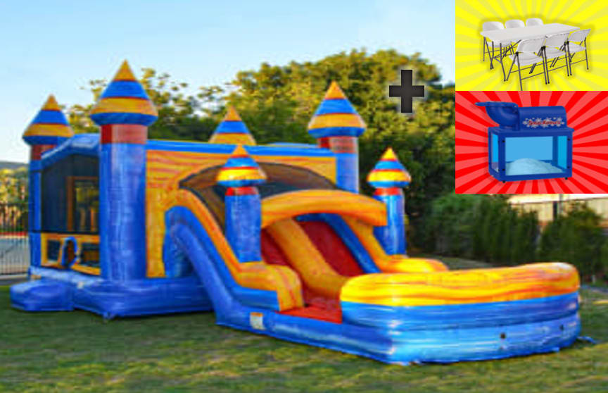 and our blue bounce house with slide combo features a bouncing area, a climb wall, basketball hoop, slide, pool and a tunnel. Supervision required at all times.