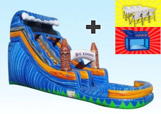 This package includes two 6 FT tables,16 white plastic chairs, and a sno cone machine.