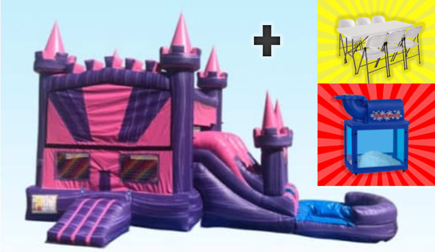 Every princess deserves a castle! This bounce house with slide combo features a bouncing area, a climb wall, basketball hoop, slide, pool and a tunnel. Supervision required at all times.
