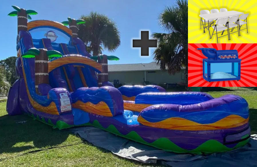 22 FT Tropical Dual Lane Wet/Dry Slide with 2 tables 16 chairs and a sno cone machine